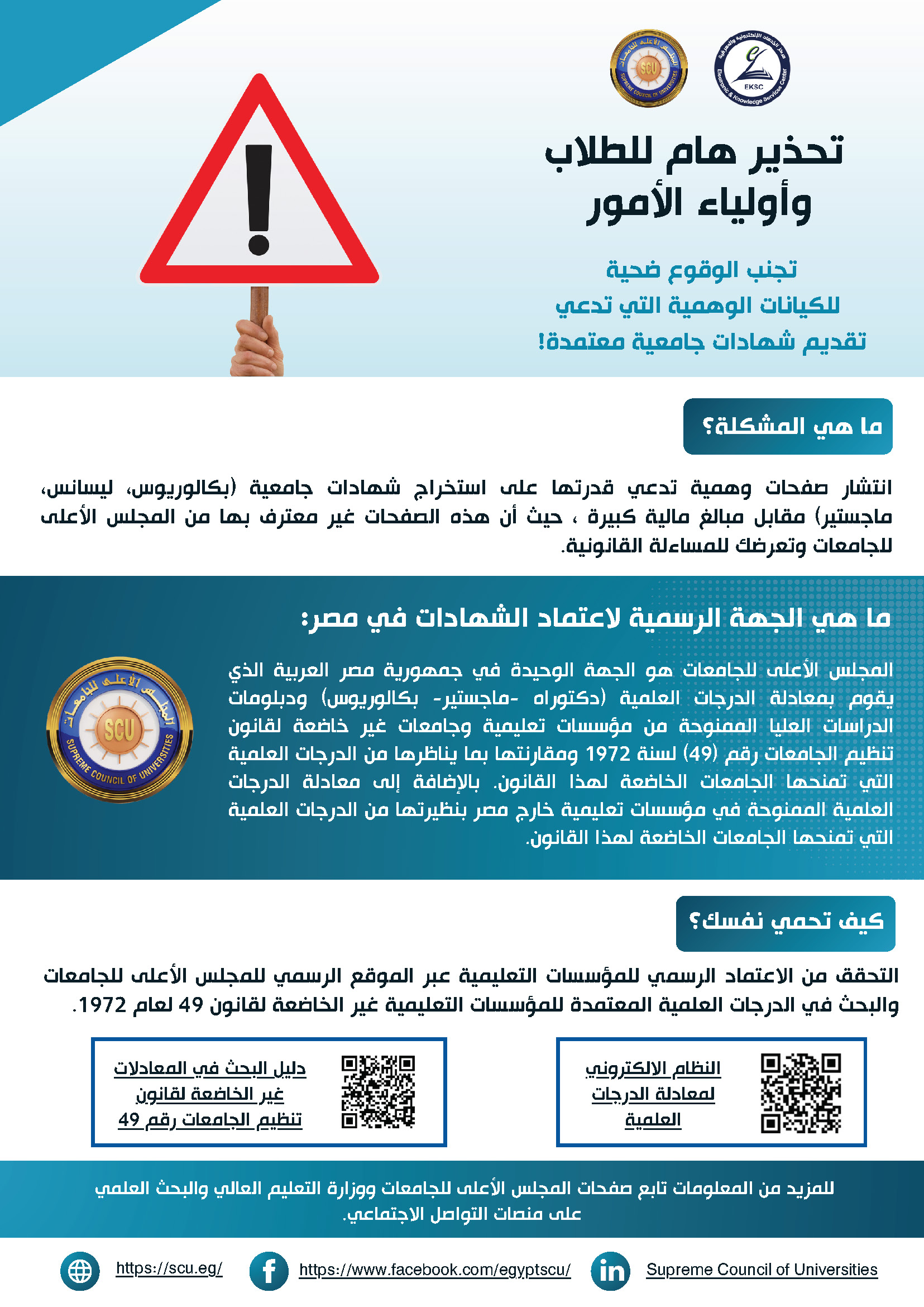 يُرجى التأكد من الاعتماد الرسمي للمؤسسات التعليمية عبر الموقع الرسمي للمجلس الأعلى للجامعات، والتحقق من الدرجات العلمية المعتمدة للمؤسسات غير الخاضعة لقانون تنظيم الجامعات رقم 49 لسنة 1972.
